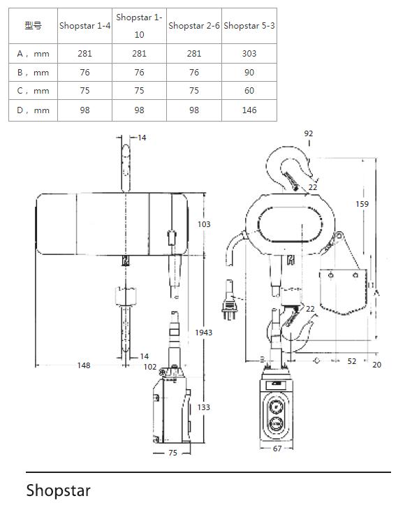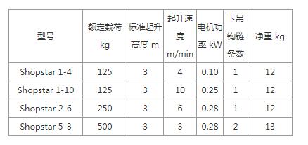Rated load 125 - 500 kg The lighter electric chain hoist in Yale gourd brand. Compact design and high reliability make shopstar an ideal choice for many light and small lifting and handling applications, including construction, maintenance, etc. Product features Standard thermal overload protection device. The brake adopts a safer normally closed structure. Only when it is powered on, the brake pressure of the spring can be opened by the action of the electromagnetic coil. Even in the case of sudden power failure, it can ensure that the object will not slide freely. The protection grade of motor is IP54 The working power supply is standard 380v-3-50hz The 125kg model can also be used for single power supply of 220 v-1-50 Hz, with higher flexibility. The protection level of control handle is NEMA4. The safety clutch can prevent the equipment from overloading and prolong its service life. The body shell is made of solid aluminum alloy, and the granular outer coating protection technology is adopted. The standard lifting chain has a hard shell and galvanized coating, and the perfect cooperation with the hoist body can ensure smooth and accurate operation. The special 10 socket design of the pick-up chain wheel provides smooth operation and greatly reduces the wear of the chain. The material of the upper and lower hooks adopts anti-aging and high toughness alloy steel. In case of overload, the deformation will occur first without breaking up suddenly, which ensures the safety of users. Product options High quality stainless steel chain (no influence on rated load) Durable chain box Optional manual and electric trolley ![]()