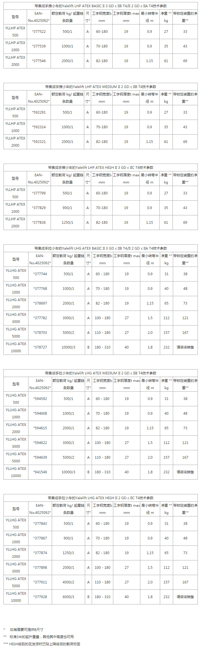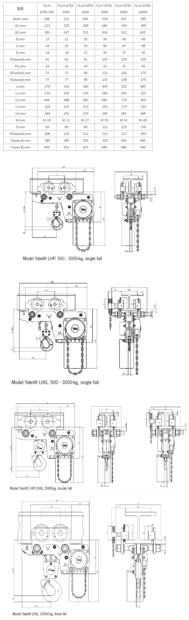 Rated load 500 - 10000 kg The ultra-low clean and firm yalelift LH integrated hand push or hand pull small lunch combination is the product of yalelift it, which can be applied to lower clearance requirements. Yalelift LH with ultra-low clearance is an integrated product of yalelift it with hand push or hand pull trolley. Yalelift LH explosion-proof hoist is an ideal choice for occasions with low clearance requirements. Product features The specially developed guide chain device can pull the lifting chain from the side and almost level with the steel beam. The newly developed integrated car model is the same as yalelift it. Single chain mechanism is adopted for those with rated load less than 3000 kg. The installation and adjustment of the trolley is very convenient, and can be adjusted according to the width of the steel beam. The trolley with rated load less than 5 tons can be provided with two specifications. Type A is a standard trolley, which is suitable for I-beam with width less than 180 mm. This model can cover almost 80% of customers needs. At the same time, type a can be easily converted to type B (I-beam with width less than 300 mm). The design of the trolley wheels (medium and high only) ensures flexible rolling under the inclination of the lower edge of I-beam of 14% (DIN 1025-1 standard). At the same time, the sealed ball bearing with lubrication treatment ensures the good operation of the wheel. The width of the low clearance trolley can be adjusted to suit a variety of steel beam models (e.g. InP, IPE, IPB). Standard car anti falling and anti tilting device. The explosion-proof model is provided with fireproof flower coating. Car with anti-collision block. Medium grade or copper plated upper hook and lifting hook. High grade adopts stainless steel lifting chain. Product options Adjustable overload protection device Chain bag Trolley fixing device, to ensure that the trolley is fixed on the rigid beam (stay position, e.g. on board) ![]()
