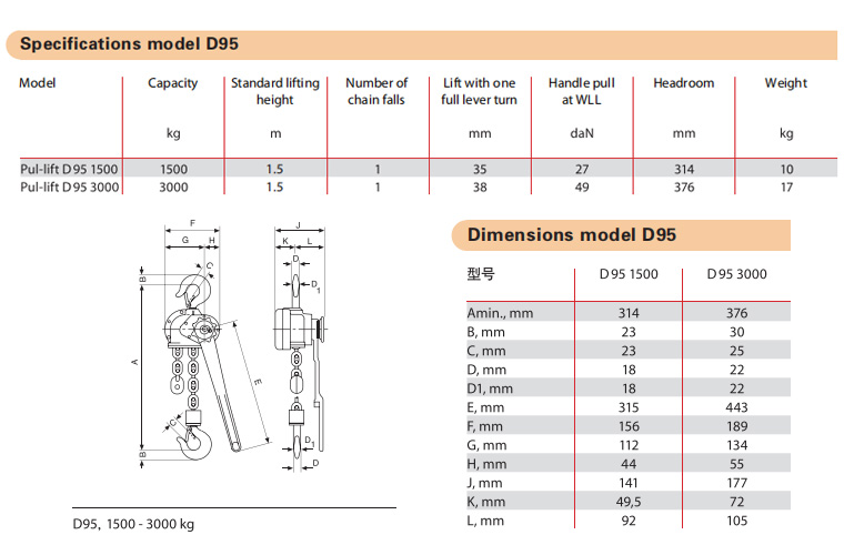 Capacity 1500 - 3000 kg The D 95 in its cast malleable iron design has taken key technical features from the proven D 85 but excels due to low tare weight and an extremely small measurement between suspension and load hooks. A versatile unit for moving, positioning and securing loads. Standard Features • Enclosed housing with housing cover, handlever and bottom block made from high tensile malleable cast iron for overall rugged construction. • The short handlever is fitted with an ergonomic rubber grip. • It has an automatically acting load pressure brake which works on the self-locking principal. For example, when used to secure loads an uninten-tional loosening of the brake is prevented when the load vibrates. • Standard free chaining device to quickly attach the load or to pull the chain through the hoist in both directions. • Alloyed steel link chain with zinc-plated resp. yellow chromated finish, in accordance with national and international standards and regulations. Options • All models can be equipped with an overload prevention device in the form of a slip clutch which is factory preset to approx. 25 % ± 15 % overload.• Hoist with sling chain. |