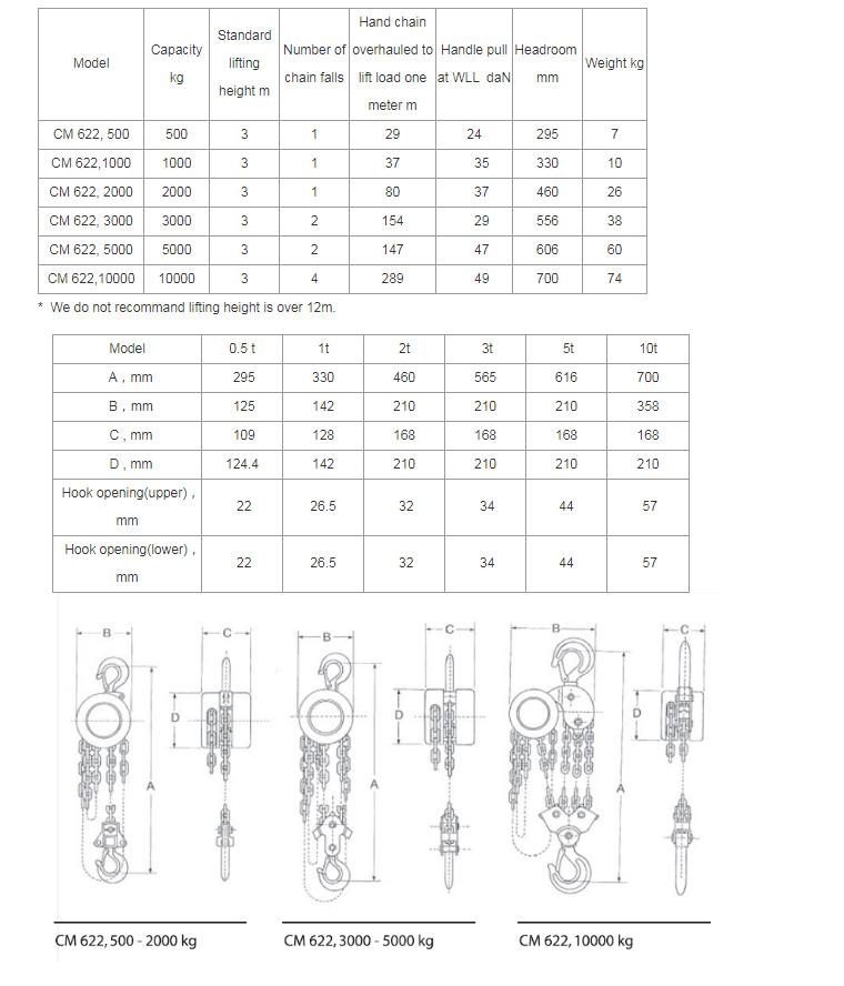Capacity 500 - 10000 kg Series CM 622 hand chain hoist has simple, efficient, economical design. Standard Features Equipped with hardened load chain for flexibility and long wear. Compact design, low headroom and lightweight steel construction for easy installation, even in confined spaces. Weston-type load brake requires no lubrication. Hand wheel cover with guide slots minimizes jamming and slipping. Forged swivel hooks with latches reduce twisting of chain and unintentiona unhooking of load when chain is slack.