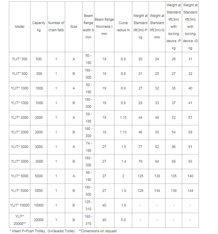 Capacity 500 - 20000 kg The combination of the Yalelift 360 with a low headroom manual trolley provides even more flexibility in the application of the Yalelift 360. Standard Features All units of this series up to a capacity of 3000 kg are provided with single chain fall and the min. headroom (Dim. A) has been further reduced. Ideal for applications with low ceilings and limited headroom. The proven and almost stepless adjustment system allows quick and easy assembly of the trolley. Trolleys up t0 5 t are offered for two beam ranges. Range A for a flange width up t0 180 mm is standard and covers approx. 80 % of all requirements. Conversion to range B for beam width up t0 300 mm can be easily accomplished. The trolley wheels are designed for a max. beam profile incline of 14 % (DIN 1025 - part l), excellent rolling features are guaranteed by prelubricated, encapsulated ball bearings. Anti-drop and anti-tilt devices as standard. Options Adjustable overload prevention device. Stainless steel load and hand chains. Chain container Corrosion resistant version Explosion proof version (ATEX) Beam locking device to secure the unloaded trolley in a fixed position on the beam (park position e.g. on ships). Available up to a capacity of 20000 kg. ![]() ![]() |