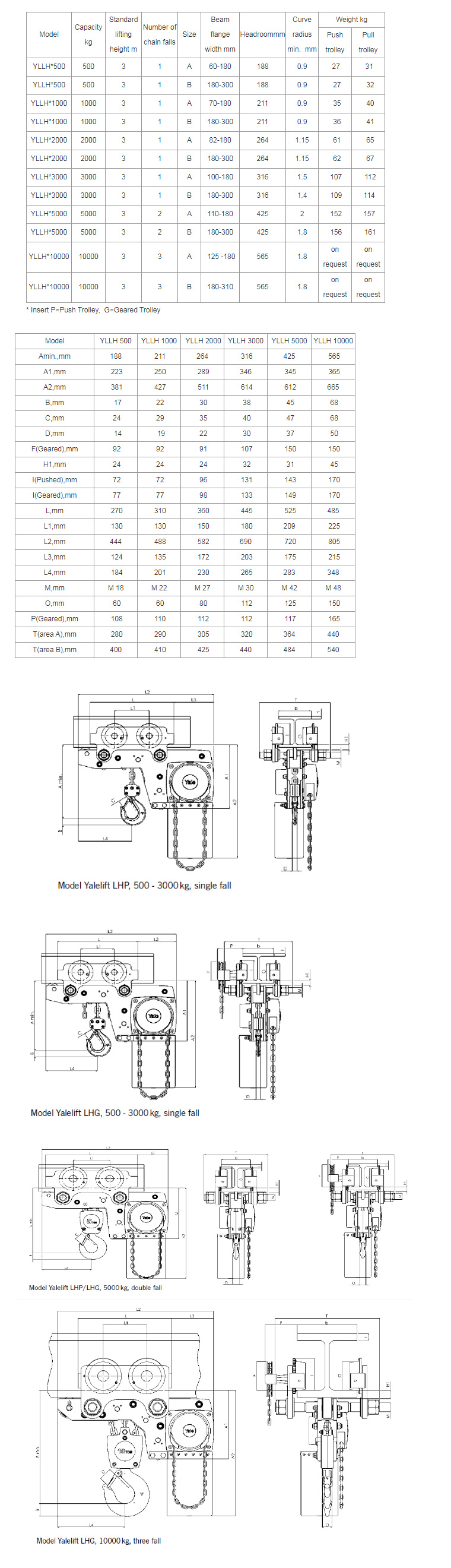 Capacity 500 - 10000 kg The hand chain hoist model Yalelift LH with integrated low headroom manual trolley is the consequent further development of the Yalelift IT, Wherever an even smaller headroom is essential. the Yalelift LH is the ideal choice. Standard Features The specially developed chain reeving system and chain guide allow the bottom block to be pulled laterally to the hoist even further up and almost against the beam flange. The integrated design of the innovative Yalelift LH uses the same manual trolleys as incorporated in the Yalelift IT series. All models of the LH series up t0 3000 kg capacity are provided with single chain fall. The proven and almost stepless adjustment system allows quick and easy assembly of the trolley. The trolleys up t0 5 t are offered for two beam ranges. Range A for a flange width up t0 180 mm is standard and covers approx. 80 % of all requirements. Conversion to range B for beam width up t0 300 mm can be easily accomplished. The trolley wheels are designed for a max. beam profile incline of 14 % (DIN 1025 - part 1), excellent rolling features are guaranteed by prelubricated, encapsulated ball bearings. The low headroom version of the Yalelift IT is adjustable to fit a wide range of beam profiles (e.g. INP, IPE, IPB). Anti-drop and anti-tilt devices as standard. Excellent rolling features due to machined steel wheels mounted on pre-lubricated, encapsulated ball bearings. Options Adjustable overload prevention device. Stainless steel load and hand chains. Chain container Corrosion resistant version Explosion proof version (ATEX) Beam locking device to secure the unloaded trolley in a fixed position on the beam (park position e.g. on ships). Available up to a capacity of 10000 kg.