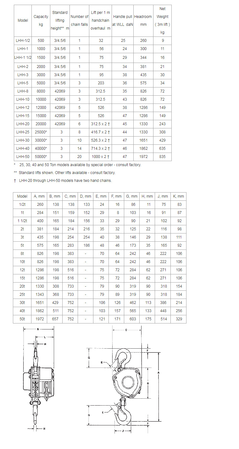 Capacity 500 - 50000 kg Stamped steel hand chain hoists are an excellent low cost option in the Coffing line. The compact lightweight design is ideal for construction and contractor applications where portability and easy rigging are critical. Standard Features CAPACITIES & LIFT - Rated loads from l/2 t0 20 Tons in stock with standard lifts of 10, 15 and 20 feet. Standard hand chain drop is 2-feet less than lift. Other lifts, hand chain drops and 25 - 50 Ton models available - consult factory. COMPACT and LIGHTWEIGHT - Designed for portability and easy installation. Compact gear housing provides low headroom. EASY TO OPERATE - Lubricated bearings and bushings, bearing-mounted pinions, and heattreated spur gearing ensure smooth and efficient operation with minimal effort. SAFETY & LOAD CONTROL - Mechanical load brake engages instantly for precise load holding and positioning. 3600 swivel hooks with safety latches for positive load engagement. DURABLE - Through hardened load chain provides added strength and wear resistance for greater chain life. Stamped steel housing withstands rugged conditions. EASY TO MAlhITAIN - Designed for easy inspection and maintenance. Hoist can be dismantled easily with simple hand tools. METRIC RATED ![]() |