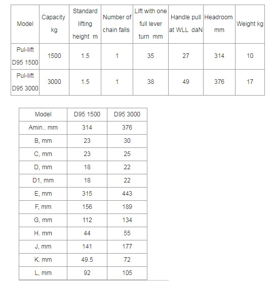Capacity 1500 - 3000 kg The D 95 in its cast malleable iron design has taken key technical features from the proven D 85 but excels due to low tare weight and an extremely small measurement between suspension and load hooks. A versatile unit for moving, positioning and securing loads. Standard Features Enclosed housing with housing cover, handlever and bottom block made from high tensile malleable cast iron for overall rugged construction. The short handlever is fitted with an ergonomic rubber grip. It has an automatically acting load pressure brake which works on the self-locking principal. For example, when used to secure loads an uninten-tional loosening of the brake is prevented when the load vibrates. Standard free chaining device to quickly attach the load or to pull the chain through the hoist in both directions. Alloyed steel link chain with zinc-plated resp. yellow chromated finish, in accordance with national and international standards and regulations. Options All models can be equipped with an overload prevention device in the form of a slip clutch which is factory preset to approx. 25 % ± 15 % overload. Hoist with sling chain.