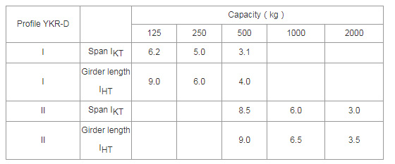Capacity 125 - 2000 kg Double-girder cranes of the YKR-D model range are also suitable for heavy loads owing to their wide load capacity range. The position of the hoist between the bridge profile sections ensures maximum utilization of the lifting height.