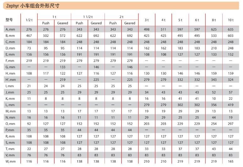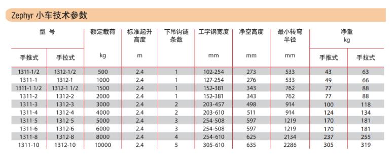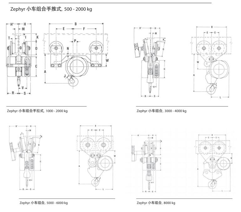 额定载荷 500- 10000公斤 Zephyr型小车组合手拉环链葫芦是由标准Zephyr吊钩式手拉葫芦机构和集成小车组成,与吊钩式葫芦配标准小车组合相比具有更低的净空高度。此系列葫芦综合了Zephyr产品线重型级别部件的所有性能。 1/2至2吨葫芦采用特殊支撑杆连接可旋转的双轮带有精细轴承的小车。可选配手推型或手拉型小车以及可以根据不同工字钢尺寸调整。是曲线应用的理想选择。 3至10吨葫芦采用集成的4轮小车,带有滚珠轴承和高强度钢质边板,适用较广泛的工字钢尺寸。轻巧外观和短轴矩是近距离和曲线运行的理想选择。 所有Zephyr型小车组合手拉环链葫芦可应用于宽型工字钢,:轨道,标准工字钢和特制或国际型号工字钢。 产品选项 ●可选配轨道吊夹 ●过载保护器 ●小车防撞块 ●链袋以及防火花和防腐蚀 ●可根据客户需要订制产品. ![]() ![]() ![]() ![]() ![]()