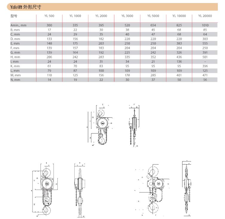 额定载荷 500-20000公斤 产品特性 ●手拉链条具有革命性的360度全方位操作角度,可以使操作者在几乎任何位置,无论是在受限的空问内或是在起升物品上方都能够有效地控制葫芦的工作。 ●Yalelift360手拉葫芦其至可以让使用者从侧面操作,从而使水平牵引及拉紧更为轻松,由于操作角度的灵活性,使用者可以在远离重物下面的危险区域进行操作。 ●所有的部件均采用高品质材质制造,并采用附加的镀层及喷漆I艺增加防腐能力。坚固的全金属外壳即使在悲劣的条件下也可以有效地保护内部机构不受损伤。 ●导链机构及齿轮传动机构都有具有外壳保护装置,可以保护这些关健部件,适应不同的操作环境。 ●起重链轮采用加硬的材料制造并经过精加I处理,保i证链条平滑及准确的动作。 ●极低的净空尺寸可以比较大限度的利用空间,增加有效提升距离。 ●表面镀锌合金钢起重链条,与葫芦机体的完美配合可以保证运行平稳及准确的运行。 ●上下吊钩的材质采用抗老化,高团度合金钢,在万一发生超我使用时会首先发生变形而不会突然断裂,保证了使用者的安全。 ●对于额定载荷为20吨型号,同样具有紧凑的外形尺寸。采用5窝轮的起升链轮,使葫芦运行更加平稳精确。山于采用了6条下乘链条的设计,保证了更快得起升速度及更轻的产品自重。 ![]()