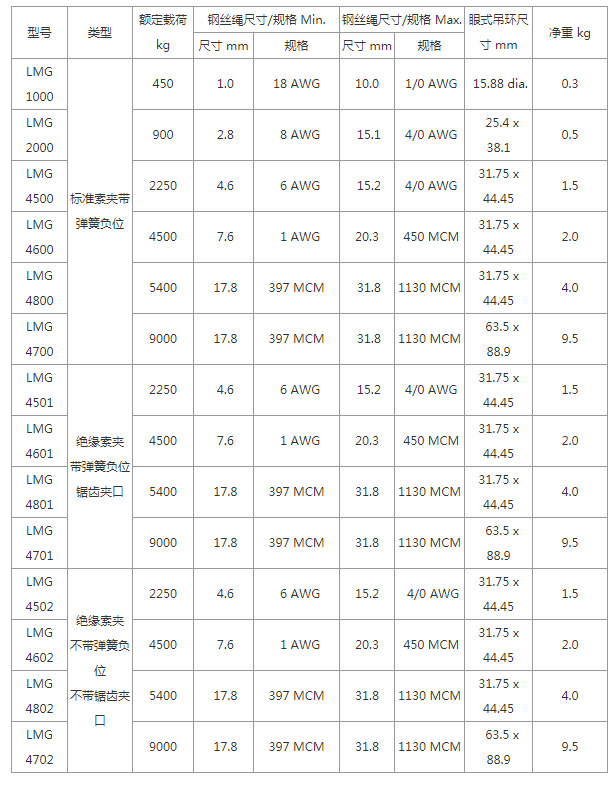 所有型号可适用于范围较广的钢丝绳葫芦型号,不需要对索夹改动很多索夹使用方便,可快速定位钢丝绳大型眼式吊环可与标准吊钩配合使用多种钳夹可选牢固便携铸造钢构造,牢固而轻巧黄色涂层增加防尘和防腐蚀功效 绝缘型标配带有弹簧负位盖板,查防止索夹从钢丝绳上滑落机械自锁装置,在自动弹簧负位盖板打开状态下,通过带锯齿的钳口可办便定位钢丝绳