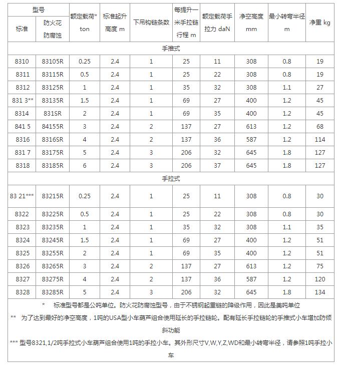 额定载荷 250 - 6000 公斤 USA型手拉环链葫芦采用大胆的设计,混合多种材质,特别的外形和综合特性,保证其具有更高的韧度和坚固品质,高效平稳的操作以及可靠性非常高。 产品特性 自重轻 外壳采用峰固铝合食制造,保证高韧度品质 手拉链轮的外壳采用重型压制钢以及特殊外形设计,保证手拉链操作顺畅 采用WESTON式棘轮棘爪负载制动器,保证货物安全 标配带特有过载保护装置 具有低净空高度的优势,小车可选择手推或手拉式,1吨模型由于紧凑外形,而采用特殊手拉链轮来延伸链轮长度。且包括防倾斜装置,保证手拉链提升或下降货物时,小车不会倾斜 产品选项 防火花和防腐选项一包括合金铜吊钩、镀镍不锈钢起重链条和铝质或铜质下拉链条 ![]() ![]() ![]()